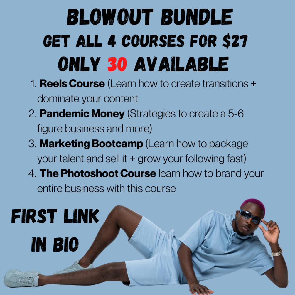 This is a live recorded bootcamp that teaches you how to package your talent and sell it. It also teaches you how to scale your business to 5-6 figures with whatever talent you have. This boot camp also gets your instagram in shape and the necessary changes in order to have a strong portfolio on instagram. The cheat code to growing your followers rapidly is also in this bootcamp course as well.